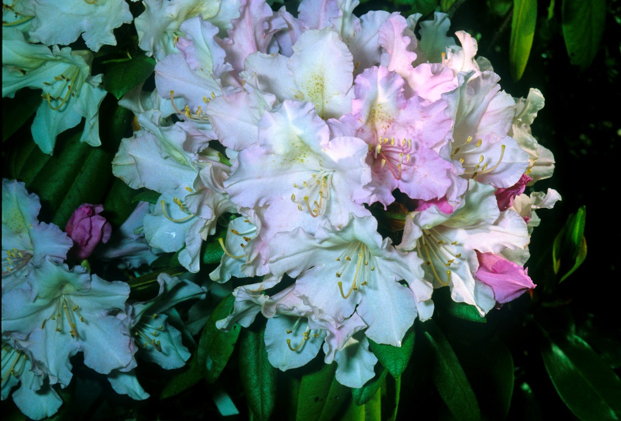 Foliage: Elepidote. Leaves are elliptic, 115mm long x 50mm wide, dull, mid green