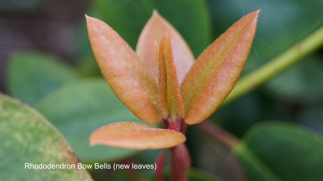 Foliage: Elepidote. Leaves are ovate, 40-65mm long x 30-40mm wide, dark green above, paler green below.
