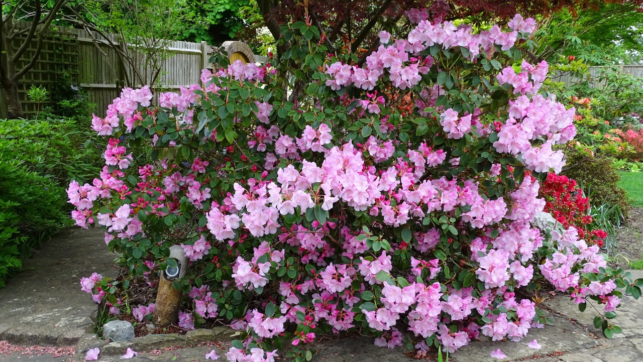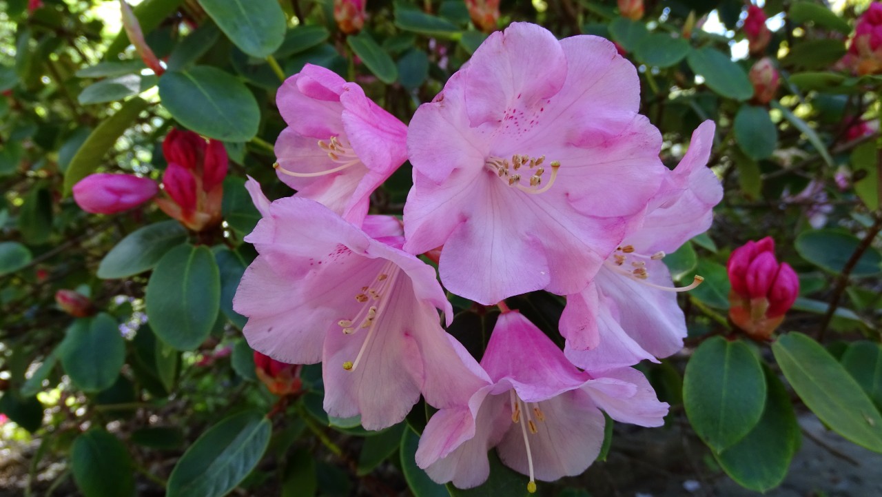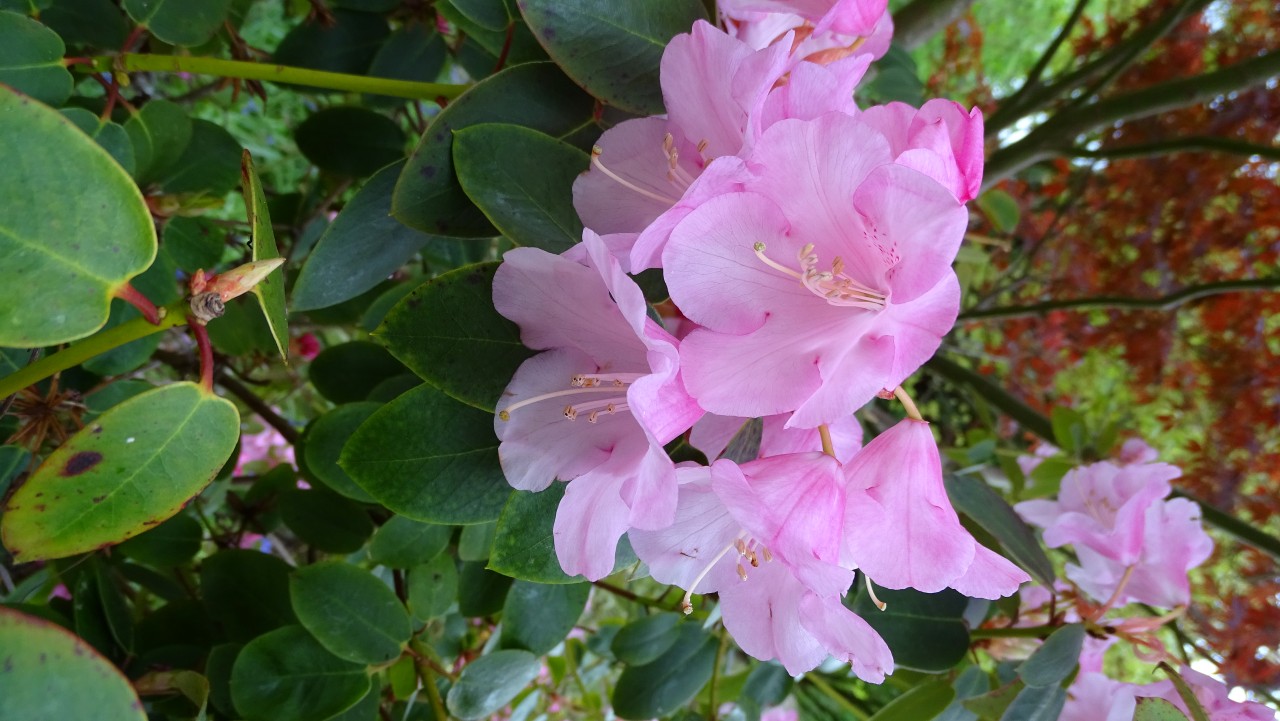 Flowers: Lax trusses of 4-7 broadly campanulate flowers, 45mm long x 55-60mm wide; deep cerise in bud, opening pink which fades to pale pink at the margins and with age, with a few crimson spots.