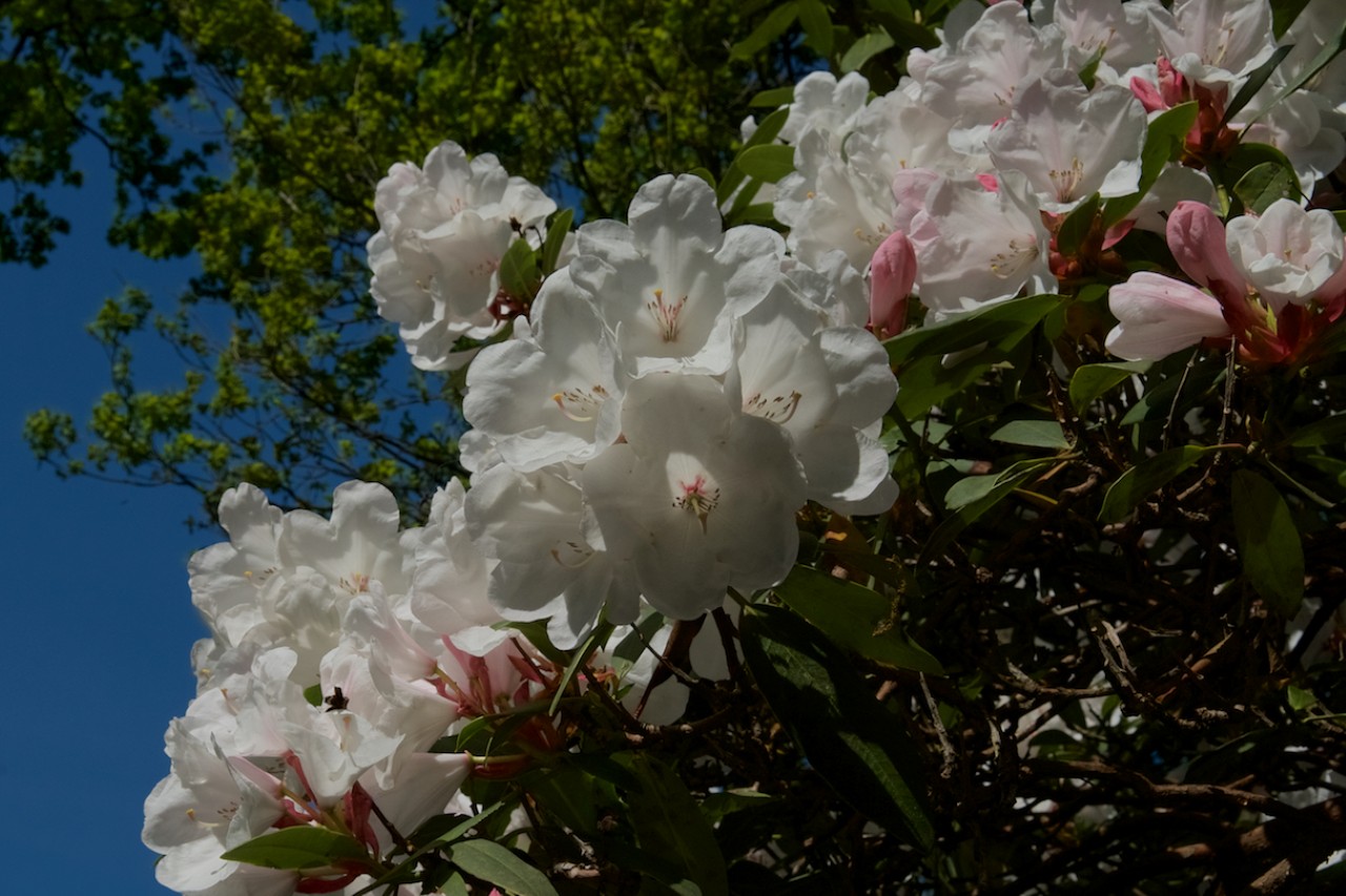 Flowers: Rounded trusses of 9-15, funnel-shaped flowers; 75mm long x 90mm wide; strong purplish pink in bud, opening pure white, with a slight, red basal blotch