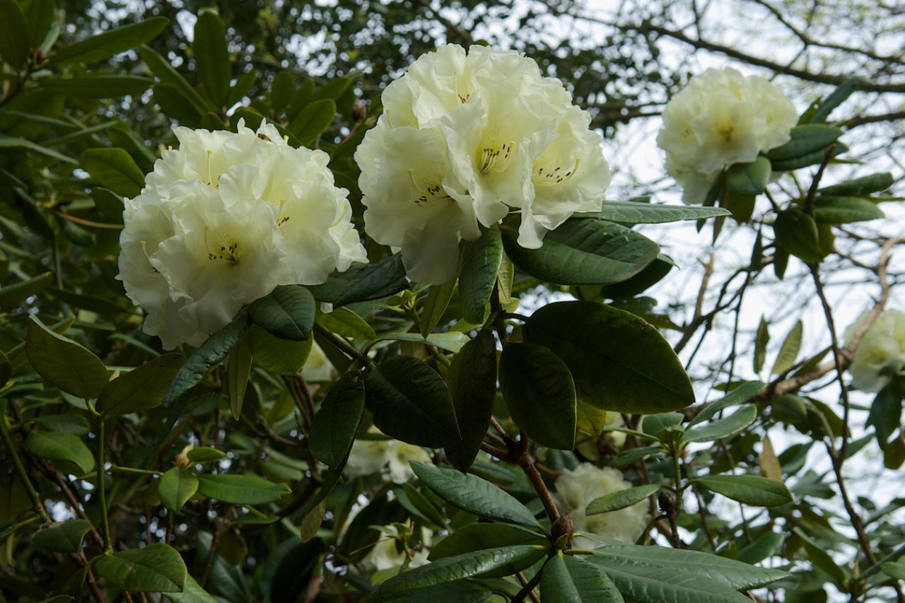 Flowers: Compact trusses of 8-10 broadly campanulate flowers, 50mm long x 75mm wide; light greenish yellow to pale yellow with a ray of crimson spots in the throat