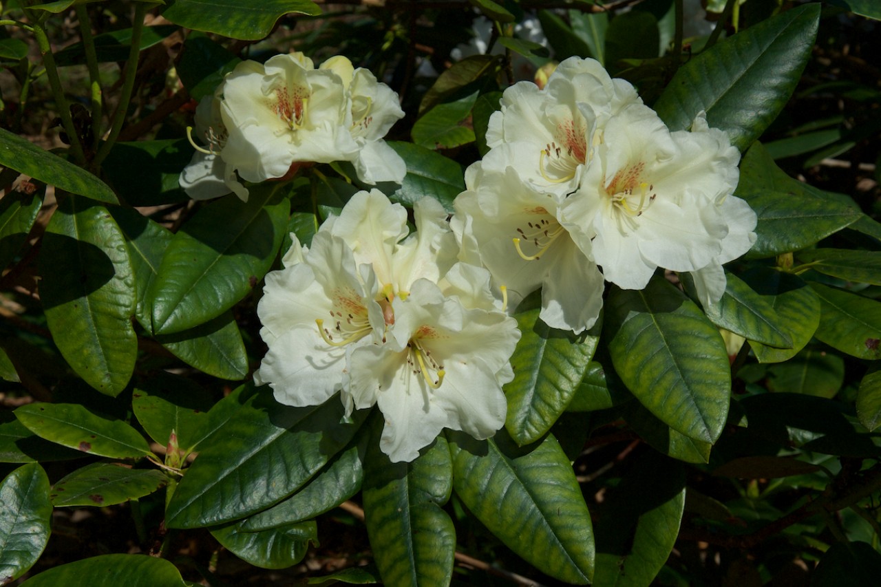 Foliage: Elepidote. Leaves are elliptic to broadly ovate, 75-130mm long x 34-72mm wide; glossy dark green above with impressed veins, hairless