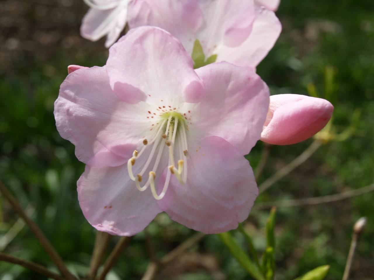 Flowers: Trusses of 3-6 rotate funnel-shaped, single flowers, opening just before or at the same time as the leaves. Flowers are 30-40mm long × 56-80mm wide; pale to rose pink or white, spotted red-brown